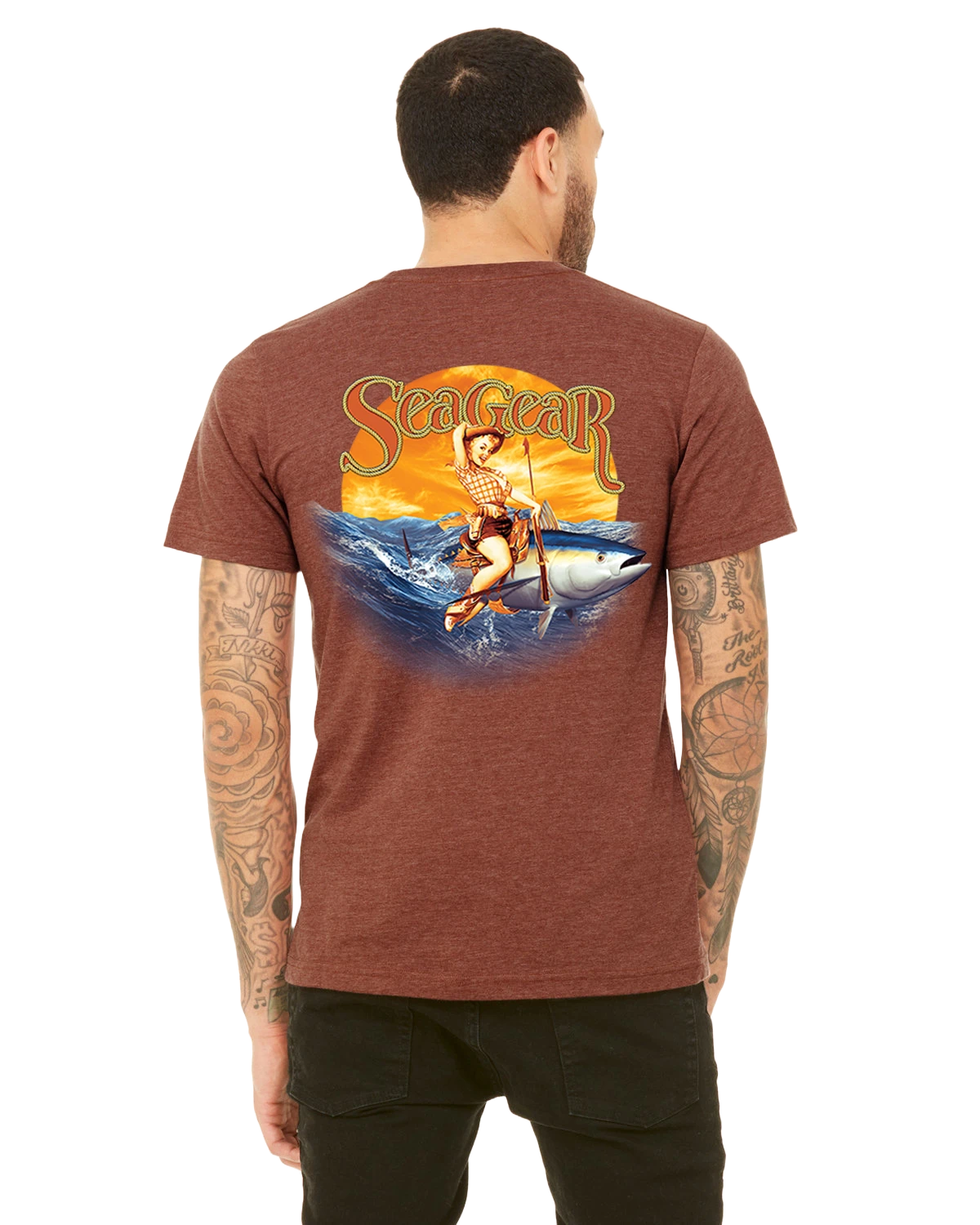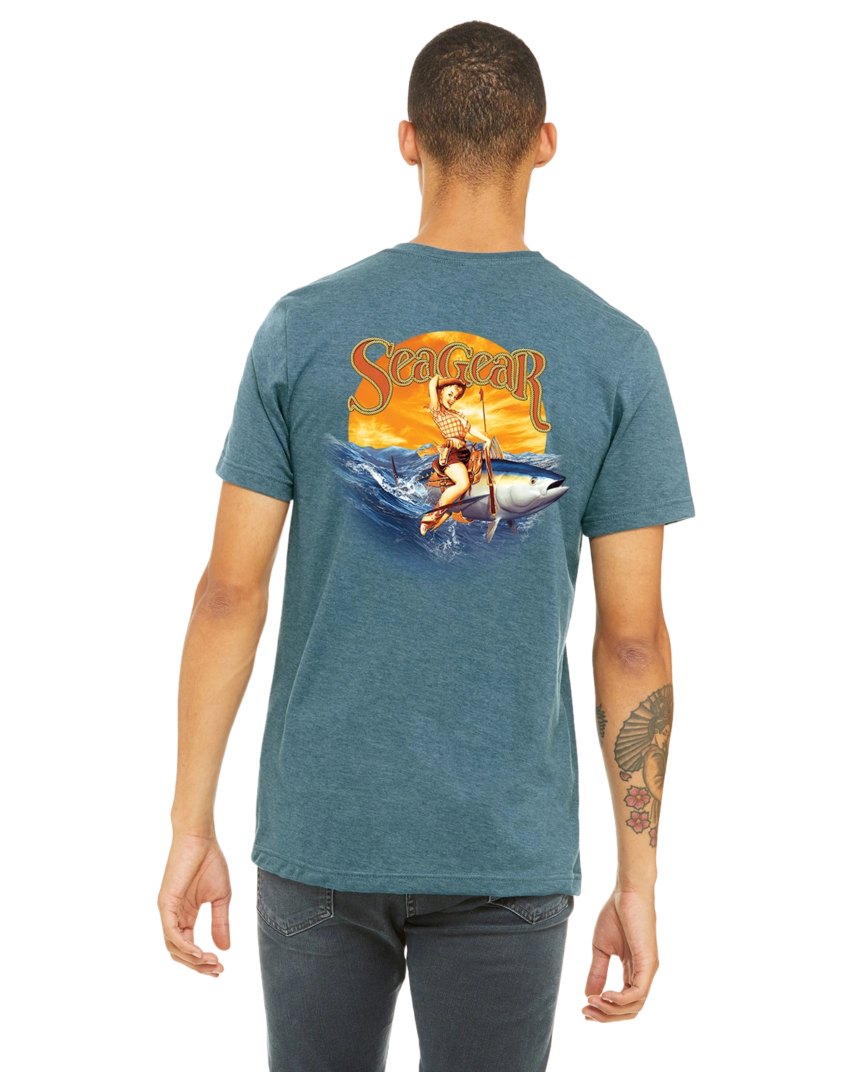 Our “Saltwater Cowgirl” graces the rear of this garment, paying homage to the vibrant pin-up art that once brought luck and nostalgia to sailors at sea. Meanwhile, the front pocket proudly displays the Sea Gear Marine emblem, symbolizing your preparedness for wherever the ocean’s currents lead.