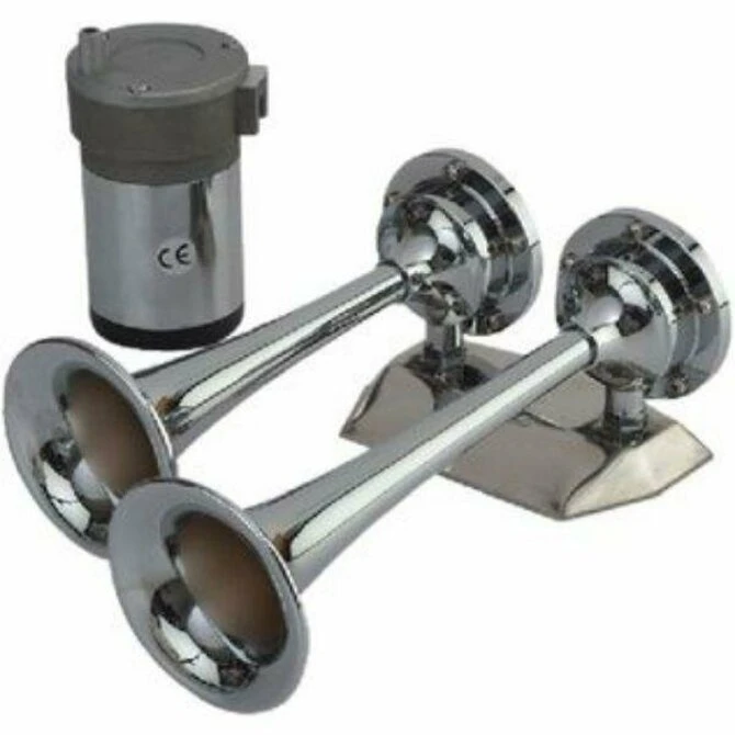 MaxBlast Mini Dual Trumpet Air Horn is constructed of durable chrome plated brass. When installed, the trumpet should point slightly downward to permit water drainage. Display pack includes horn, compressor, air tubing, and mounting hardware. At 125 decibels and a frequency (Hz) of 630±15A/525±15A, this horn meets the US Coast Guard’s COLREGS, US Inland Navigation Rules, Annex III Regulations, and ABYC standard A-23 for boats up to 20 meters (66’). 12VDC. Maximum: 20A