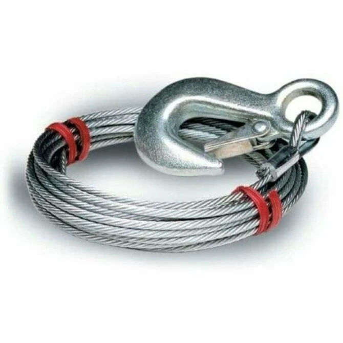 Galvanized steel 7×19 aircraft cable. Cables are fitted with a heavy duty electro galvanized latch hook, pull proof loop, and a fastener end for replacement. Use on POWER WINCH, DL, SUPERWINCH and other quality power winches.